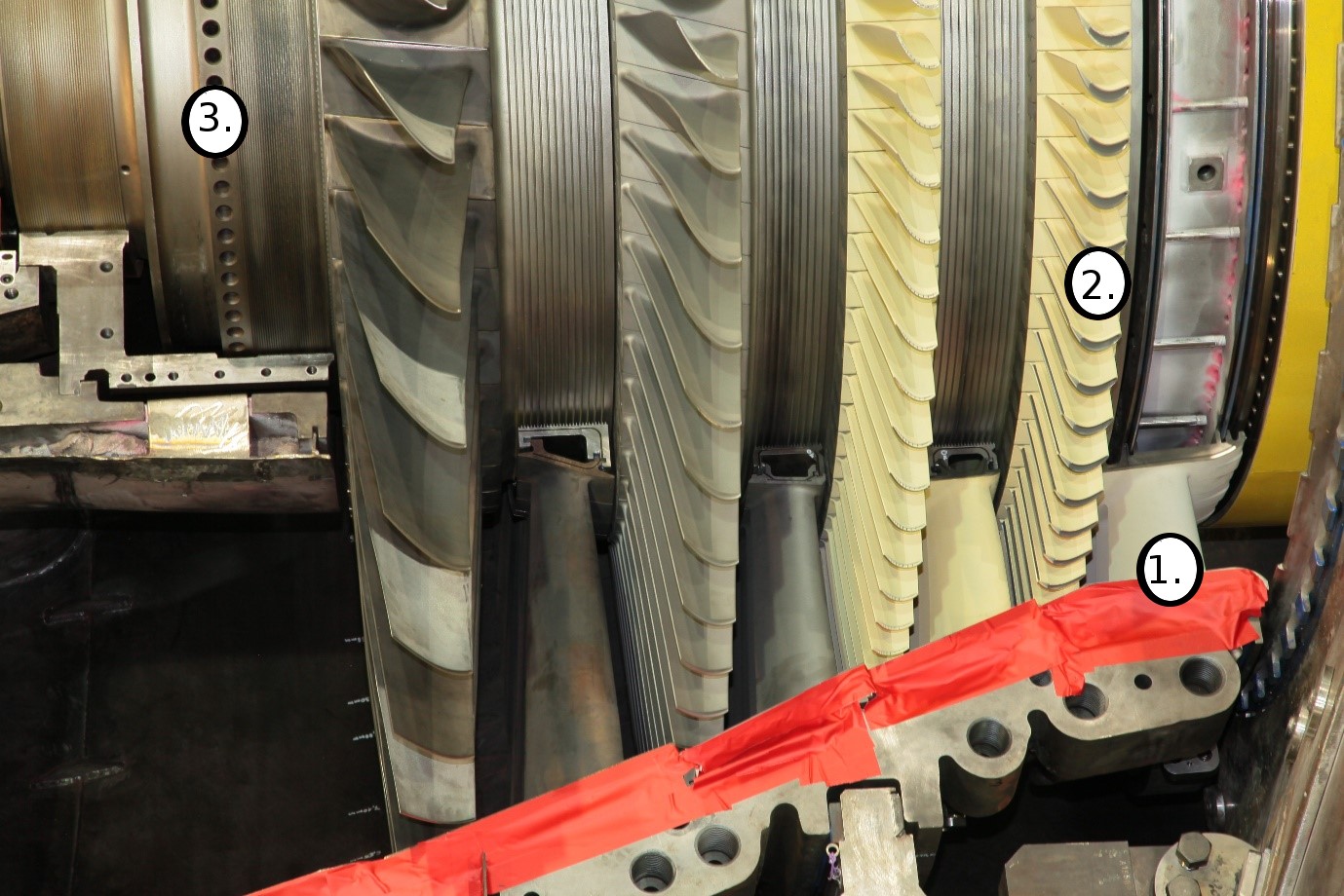 Kaasuturbiinin jouksusiivet vaiheet 1,2,3 ja 4. Suuruusjärjestyksessä nro 1 on oikealla pienin ja lyhin. Aina ennen juoksusiipeä on johtosiipi, johtosiivet alapuoliskossa vielä paikoillaan.