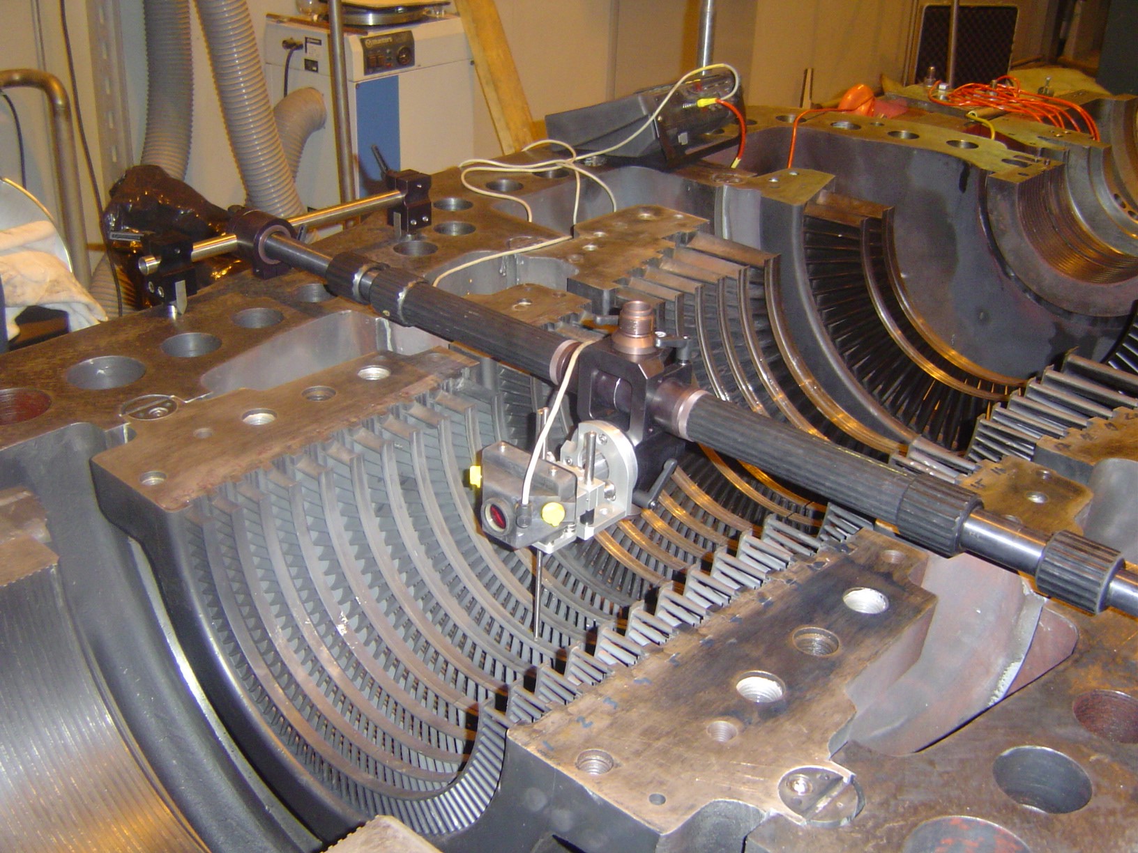 1. Kuvassa höyryturbiinin sisäpesän mittaus huollon yhteydessä, eli laserilla katsotaan johtosiipien linjaus. Mittauksessa selviää pitääkö johtosiipien paikkaa säätää johonkin suuntaa.