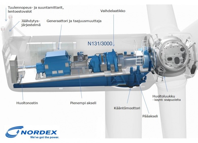 Tuulivoimalan konehuone Konehuoneessa sijaitsevat vaihteisto, generaattori, muuntaja sekä säätö- ja ohjausjärjestelmät. Joissakin voimaloissa muuntaja ja ohjauskeskukset voivat sijaita myös tornin alaosassa. Konehuoneen runko valmistetaan yleensä teräksestä ja konehuonetta ympäröivä ja suojaava ”kuori” lasikuidusta.